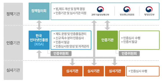 ( A ) : 과학기술정보통신부, 행정안전부와 함께 정책 협의회를 구성하는 기관으로 법, 제도 개선 및 정책 결정, 인증기관 및 심사기관 지정 업무를 수행