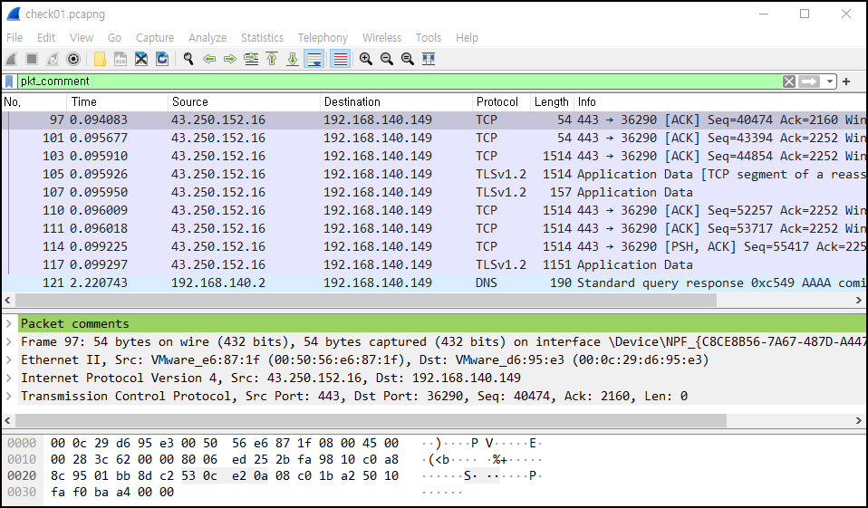 해당 Frame 번호의 패킷을 Comment 설정 후 해당 패킷만을 필터링을 해서 보이게 했다.