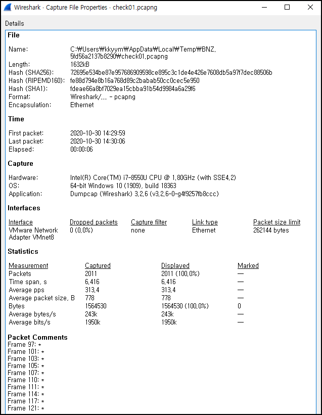 [Statistics] -> [Capture] 메뉴에서 캡쳐 파일의 요약 정보를 확인할 수 있다. Captured 파일이 2011개라는 것을 알 수 있다.