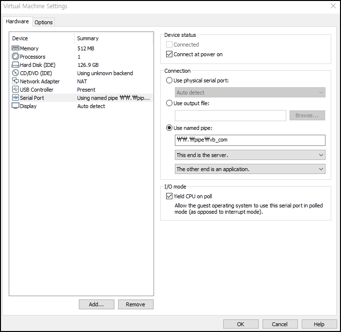 VMware Setting에서 Serial Port(직렬포트)를 추가 후 아래와 같이 입력해준다.
