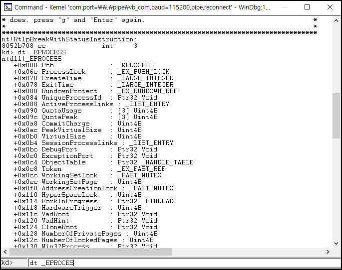 dt _EPROCESS를 입력하면 프로세스의 정보를 확인할 수 있다.