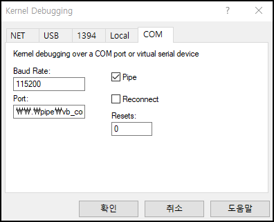 Kernel Debugging 메뉴에서 COM에서 Port 부분에 VMware의 pip를 동일하게 입력해주고 pip 선택을 한다.