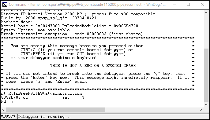 VMware 부팅 과정에서 화면이 멈추고 Windbg는 제대로 연결된 것을 알 수 있다.