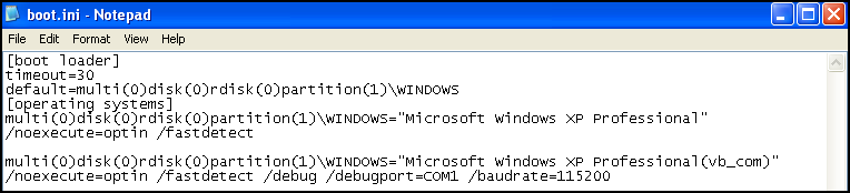 윈도우 xp의 C드라이브 위치에 boot.ini 파일에 아래와 같이 입력해준다.