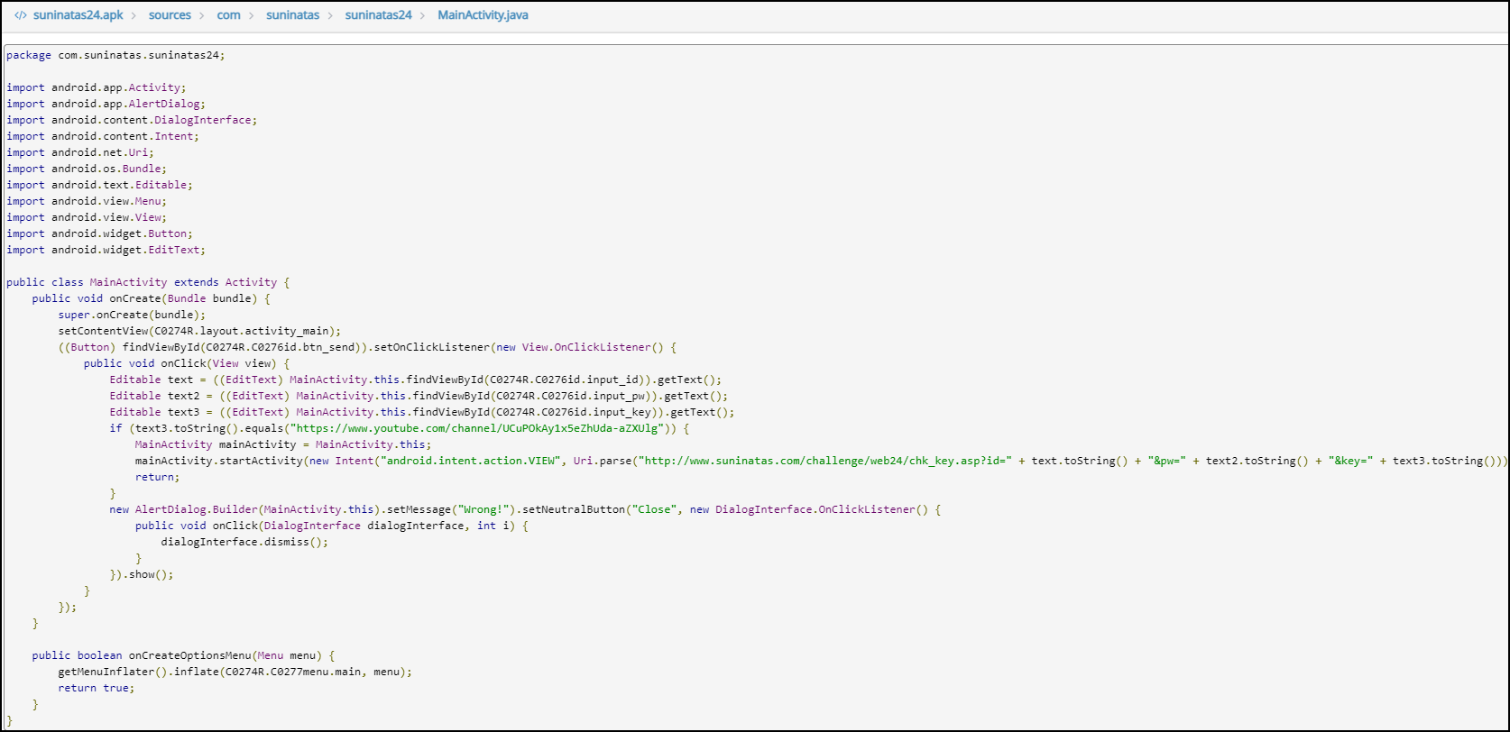 http://www.javadecompilers.com/apk 사이트를 이용해 apk파일의 소스코드를 확인했다. 조건문을 보면 text3 변수 값이 www.youtube.com/channel/UCuPOkAy1x5eZhUda-aZXUlg 인지 알 수 있고, www.suninatas.com/challenge/web24/chk_key.asp?id= 문자열을 추가해주고, 그다음 text 변수를 추가(ID), 그 다음 "&pw=", text2 변수(PW), "&key=", text3 변수(key값)를 추가해주는 것을 알 수 있다. www.suninatas.com/challenge/web24/chk_key.asp?id=[ID]&pw=[PW 입력값]&key=[Key 입력값]의 URL을 요청을 하고 있다.