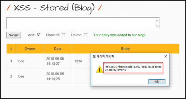 데이터를 1234를 입력해보니 추가되는 것을 확인하고 <script>alert(document.cookie)</script>를 입력해보니 쿠키 값을 보여준다.