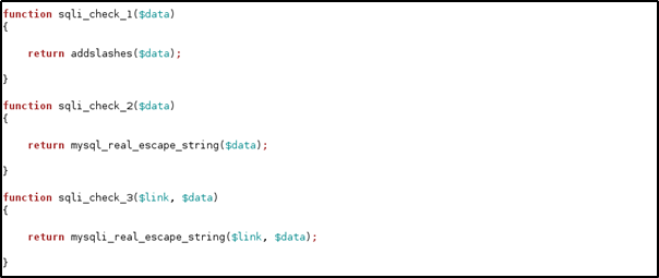 addslashes 함수를 통해 쿼터(',")같은 특수 문자들을 포함하고 있는 문자열에 역 슬래쉬(\)를 넣음으로써 오류를 최소화시키는 역할을 한다. mysql_real_escap_string 함수를 사용하여 입력한 데이터를 우회한다. 사용자 입력 값에 SQL 문법에서 사용하는 특수 문자가 있을 경우 백 슬래시를 붙여 입력 데이터를 SQL 문법으로 인식하지 않게 방어한다.