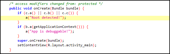 MainActivity 부분에서 a메서드를 호출하면서 루팅 탐지 메시지를 전달해주고 있다. [Ctrl]을 누른 상태에서 a를 클릭하여 어떤 메서드인지 찾아보았다.