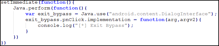타임아웃을 방지하기 위한 setImmediate 사용하고 클래스에 대한 객체 받아오기 위해 java.use를 사용한다.