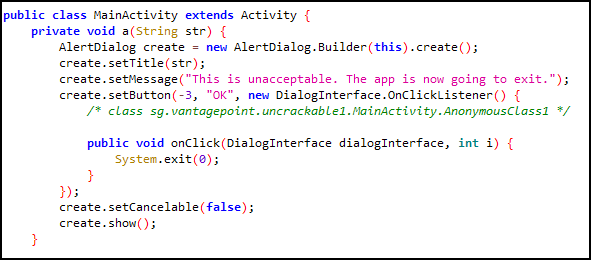 Main Activity 코드내에 a라는 메서드가 존재하며 인자 값으로 string을 받고 있다. 이 메서드는 alert dialog라고 해서 dialog창을 만들면서 메시지를 만들고 있다. 이 메시지는 해당 앱에서 보여주는 것과 같다.