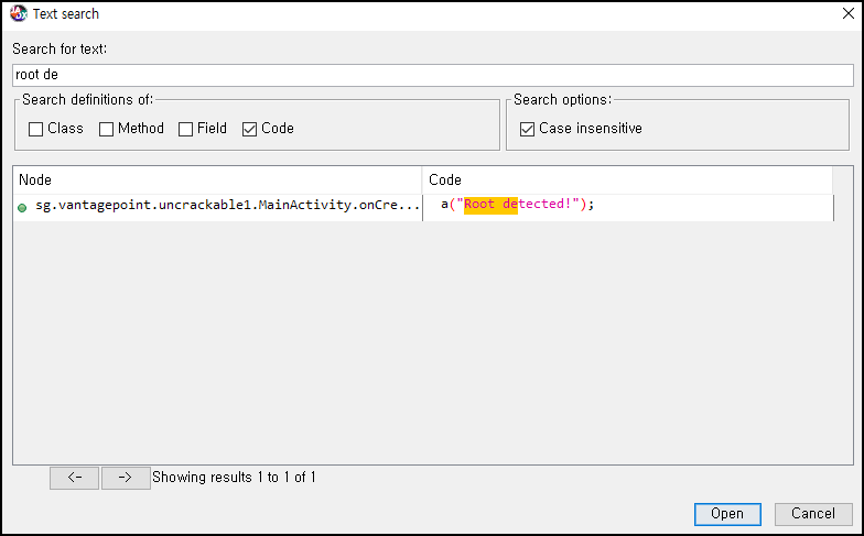 Text Search 기능을 통해 root detected 메시지를 찾았다.