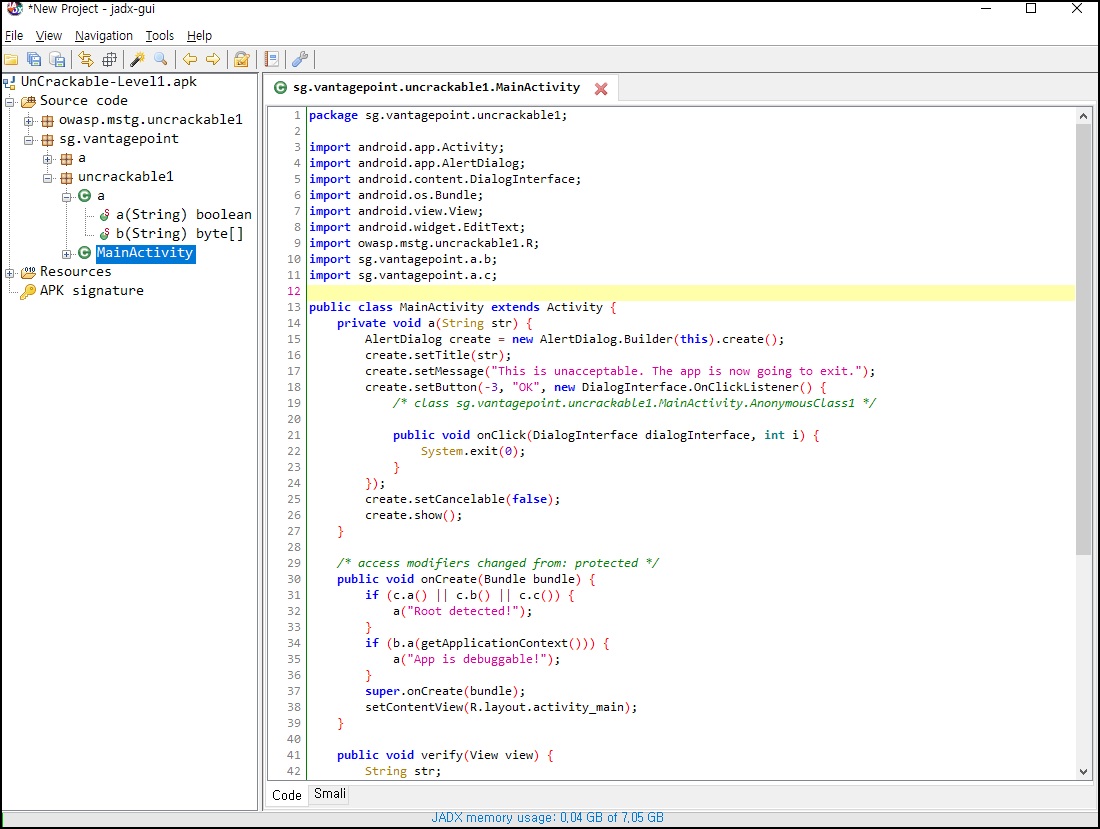 해당 apk파일을 jadx로 불러와서 디컴파일된 코드를 확인할 수 있다.