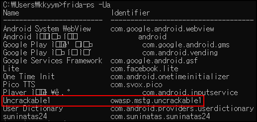 frida-ps -Ua 명령어를 통해 해당 앱의 실행 이름을 알 수 있다.