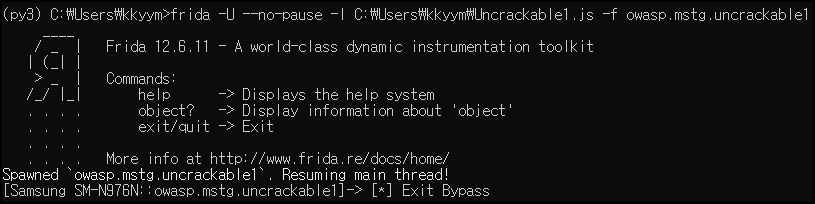 해당 스크립트를 실행시키면 Exit Bypass 메시지를 확인할 수 있다.