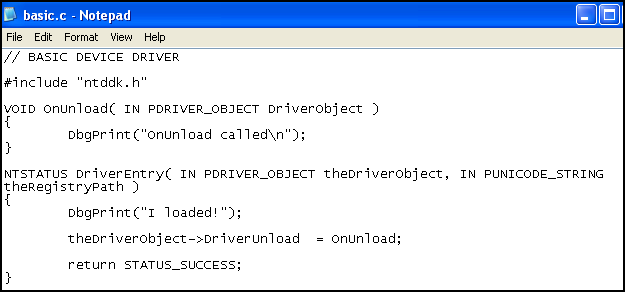 DriverEntry 함수가 커널로 Load가 됬을 경우 내부의 함수가 실행된다. 로그를 남기면 "I loaded" 메시지를 보여주고 onUnload가 가능할 수 있도록 작성되었다.