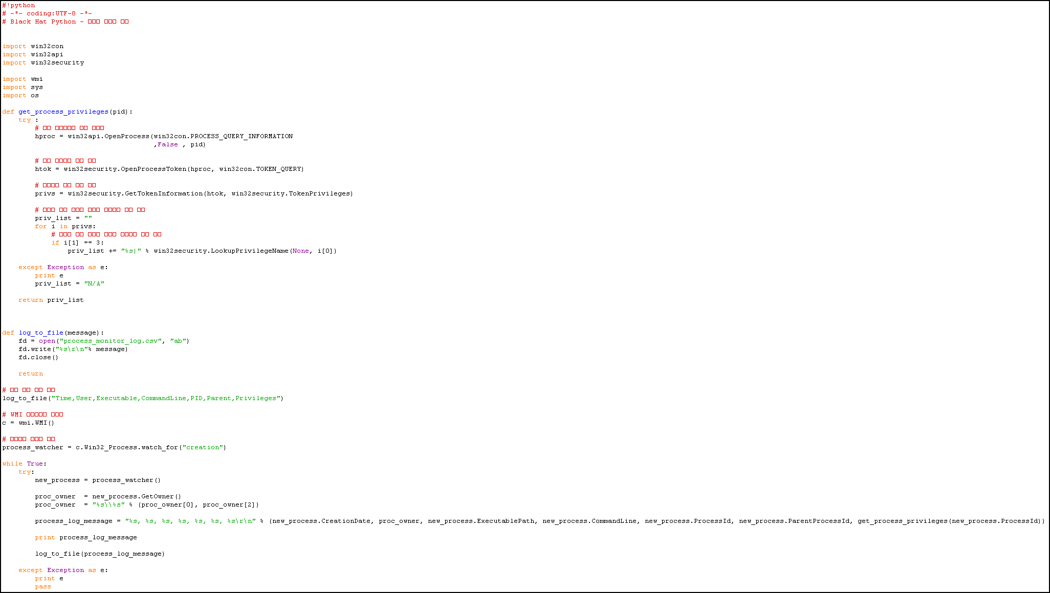 log_to_file 함수를 통해 process_monitor_log.csv 파일로 저장 하고 WMI를 통해 c 객체 생성한다. 객체 중에서 콜백을 등록할 수 있는 creation 등록을 해서 process_watcher라는 함수를 생성하고 new_process 전달한다. new_process가 주체가 되서 자신의 정보를 가져와서 세팅하고 new_porcess가 생성될 때마다 콜백을 한다.
