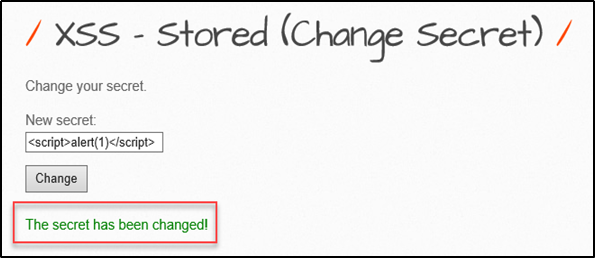 <script> alert(1)</script> 스크립트를 입력했는데 The secret has been changed! 메시지를 보여준다.