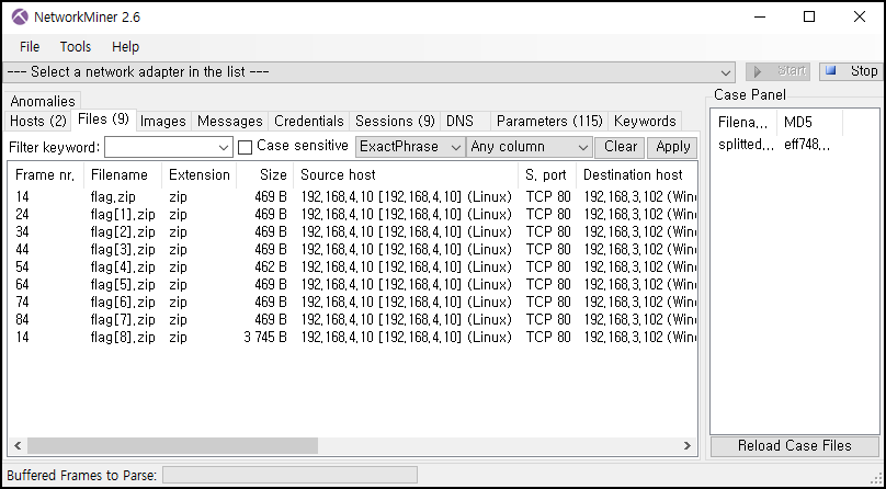 NetworkMointer 파일에서 Files를 보면 flag.zip 압축파일을 확인할 수 있다. flag[8].zip만 크기다 다른 것을 알 수 있다.