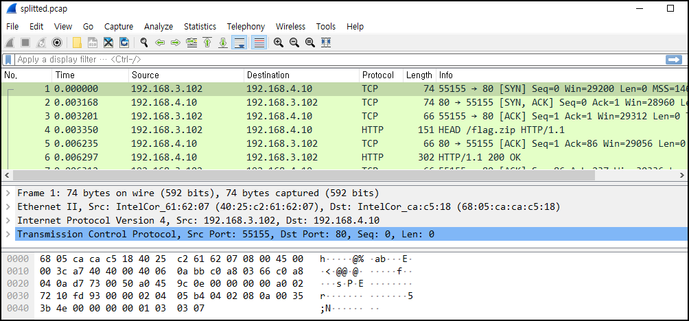 해당 파일의 압축을 풀면 splitted 패킷 파일이 보여 실행시키면 /flag.zip 파일을 확인할 수 있다.