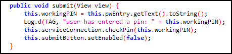 submit 메서드를 보면 입력된 값이 로그로 출력되는 것을 확인할 수 있다. 입력된 PIN이 workingPIN에 들어간다.
