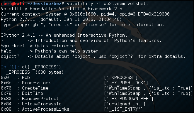 volatility를 사용해 be2.vmem 메모리의 EPROCESS를 검색했다.