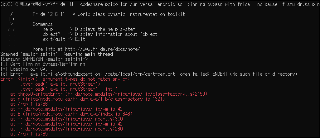 codeshare에서 불러온 코드를 실행시키면 /data/local/tmp/cert-der.crt 파일이 없다고 에러 메시지를 보여주는 것을 알 수 있다.