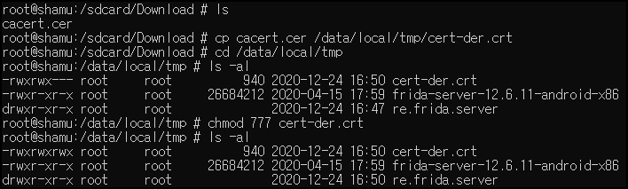 Download 폴더에 있는 인증서를 /data/local/tmp/cert-der.crt 복사 후 777 권한을 주었다.