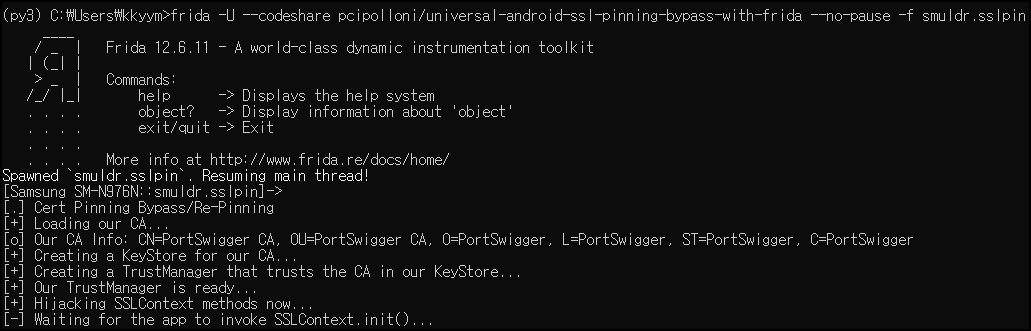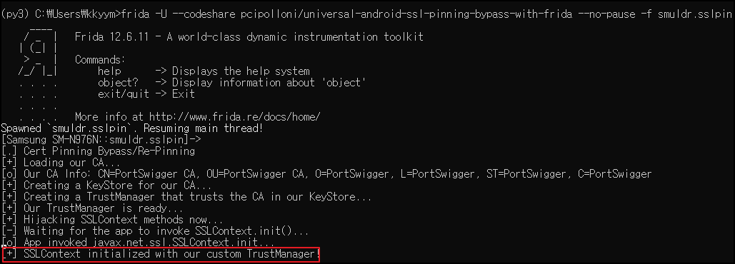 SSLContext initialized whit our custom TrustManager 라는 신뢰 있는 메시지가 뜨는 것을 확인할 수 있다.