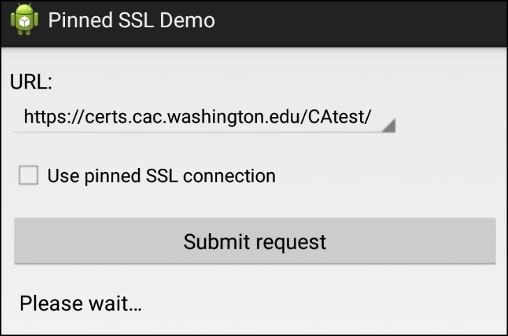 Pinned SSL Demo 앱을 실행시킨 후 Submit requset 버튼 클릭 시 Connection refused 메시지를 확인할 수 있다.