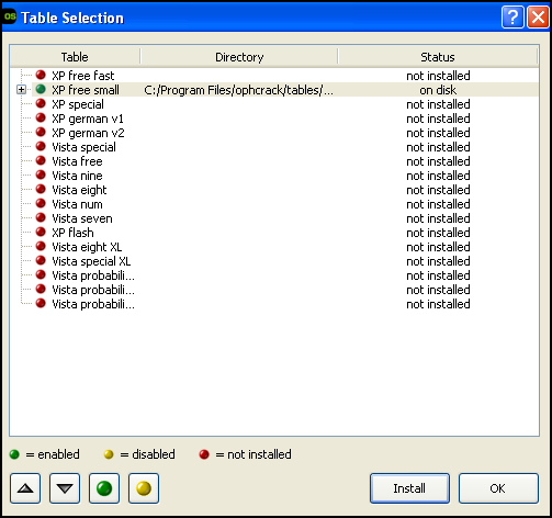 Tables 메뉴에서 Install을 클릭하면 Browse For Folder 메뉴에서 ophcrack의 tables에 xp_free_small 선택했다.