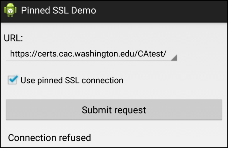 Pinned SSL Demo 실행 후 SSL connection 체크 후 Submit을 하면 Connection refused 되는 것을 알 수 있다.
