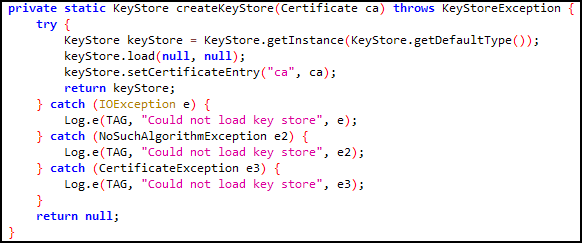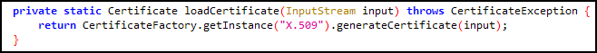 return문을 보니 인자값으로 전달 받은 input 값이 loadCertificate() 메소드의 인자 값으로 전달되고, 이 메소드의 반환값이 createKeyStore() 메소드의 인자 값으로, 그 반환값이 다시 createTrustManager() 메소드의 인자 값으로, 마지막으로 그 반환값이 createSSLContext() 의 인자 값으로 전달되어 반환되는 값을 최종적으로 반환하고 있다.