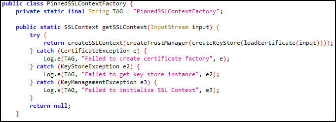 PinnedSSLDemoActivity 클래스 내의 onSubmit() 메서드가 호출되었을 때, SSL Pinning 사용 체크박스에 체크가 되어 있다면 sslContext 라는 변수에 getPinnedSSLContext() 메소드의 반환 값이 저장된다. 체크가 되어 있지 않다면 기본값인 NULL이 저장된다. 이 sslContext 의 값에 따라 SSL Pinning이 적용된 암호화 통신을 할지 안 할지 결정하는 것을 알 수 있다. sslContext의 값을 결정하는 getPinnedSSLContext() 메서드의 로직을 확인해 볼 필요가 있다.