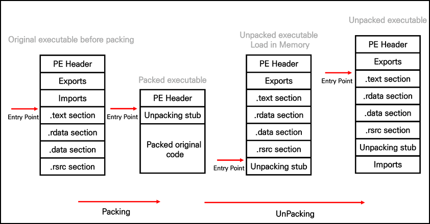 패킹을 하면 해당 형태는 사라지고 Packed original code, Unpacking stub의 형태로 변하게 된다. Unpacking stub는 프로그램이 실행될 때 Packed original code의 압축을 풀게 된다. 따라서 EP의 위치는 Unpacking stub로 변경된다.