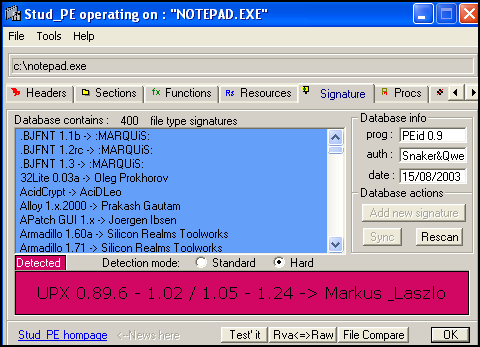 Stud_PE 프로그램을 이용해 Signature 항목을 보면 UPX 패킹된 것을 알 수 있다.