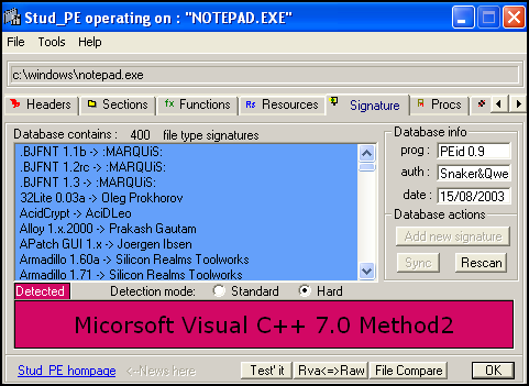 Stud_PE 프로그램을 이용해 Signature 항목을 보면 Micorsoft Visual C++ 패킹되지 않은 것을 알 수 있다.