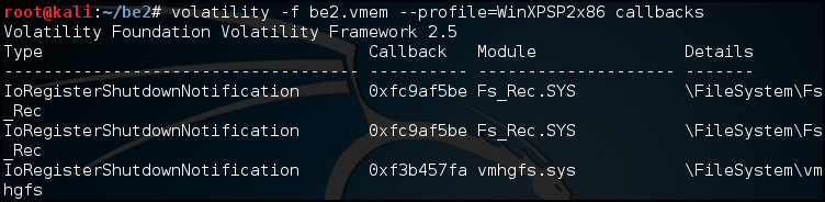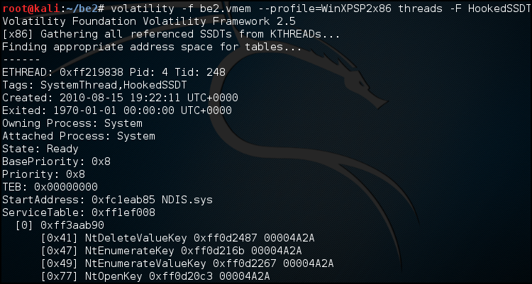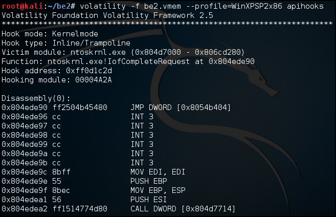 apihooks를 통해 중간에 IAT 수정한 것을 찾을 수 있다. ntoskrnl.exe IofCompleteRequest 함수에 후킹이 걸린 것을 알 수 있다. 00004A2A 주소로 넘어가는 것을 알 수 있다.