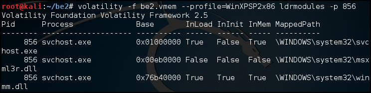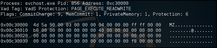DLL를 보면 서비스를 제공하는 프로세스 svchost.exe를 확인할 수 있다. pid: 856, vad: VadS, Protection: ERW, 헤더: MZ를 보아 의심스러운 프로세스인 것을 알 수 있다.