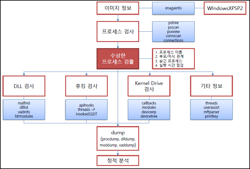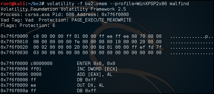 malfind 명령어는 VAD 태그와 페이지 권한들 같은 문자들을 기반으로 사용자 모드 메모리에 숨겨져 있거나 삽입되어 있는 코드나 DLLs를 찾아내는데 도움을 준다.