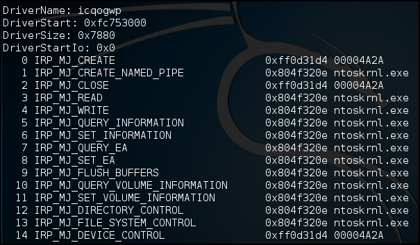 악의적인 모듈 00004A2A 주소를 보면 icqogwp driverirp가 참조하고 있다.