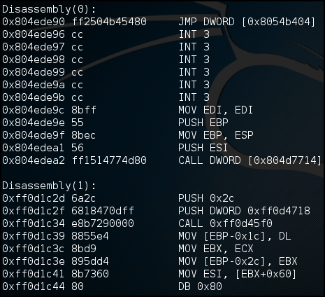 다시 apihook를 보면 0x8054b404에서 0xff0d1c2d로 JMP 하는 것을 알 수 있다. Hook address 주소랑도 일치하는 것을 알 수 있다.