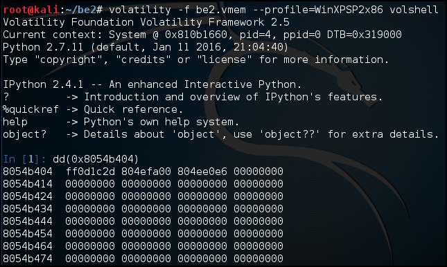 volshell를 통해 dd(0x8054b404) 주소를 확인했는 데 ff0d1c2d라는 것을 알 수 있다.