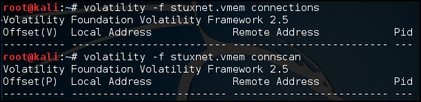 외부 네트워크와 연결되었는지 확인을 위해 connections, connscan을 사용했지만 연결된 네트워크는 없는 것을 알 수 있다.