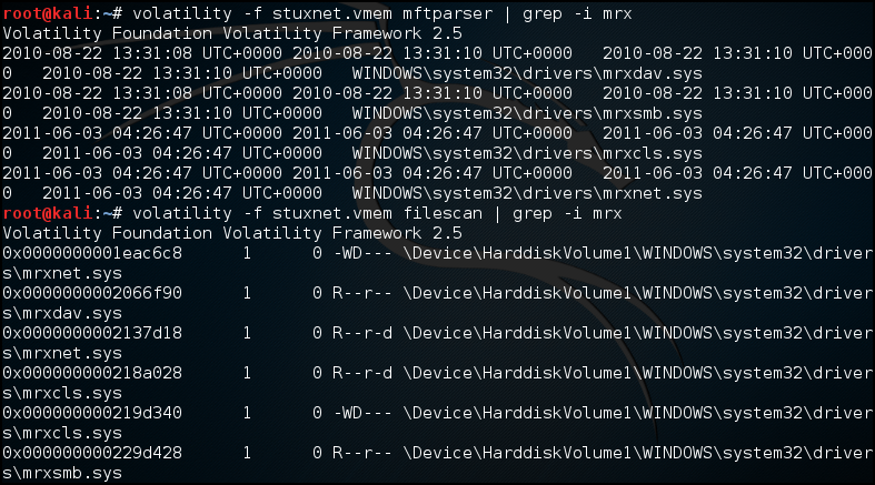 mftparser를 통해 프로세스 위치와 시간을 알 수 있고 filescan을 통해 mrx 종류에 대해 알 수 있다.