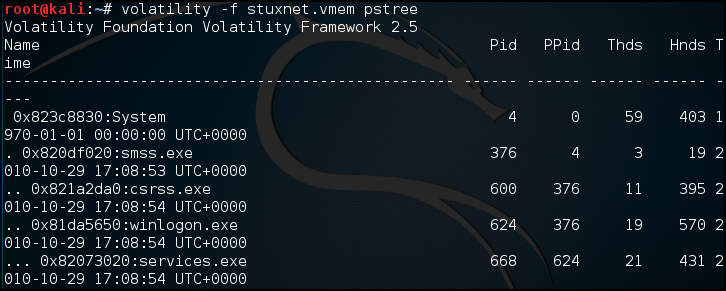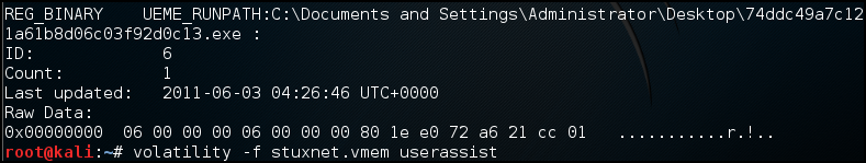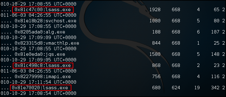 imageinfo를 통해 WinXPSP2x86 서비스 팩 하고 2011-06-03 04:31:36 날짜 생성된 것을 알 수 있다.