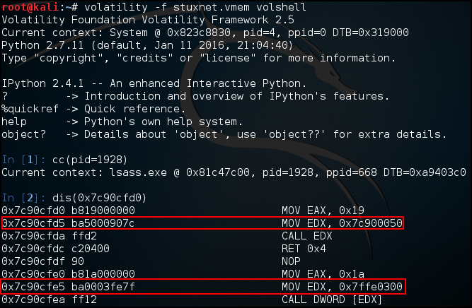 volshell를 통해 후킹 된 코드를 보면 0x7c90050은 변조된 코드이고 0x7ffe0300은 코드 섹션을 호출하는 것으로 보아 정상적인 코드인 것을 알 수 있다.