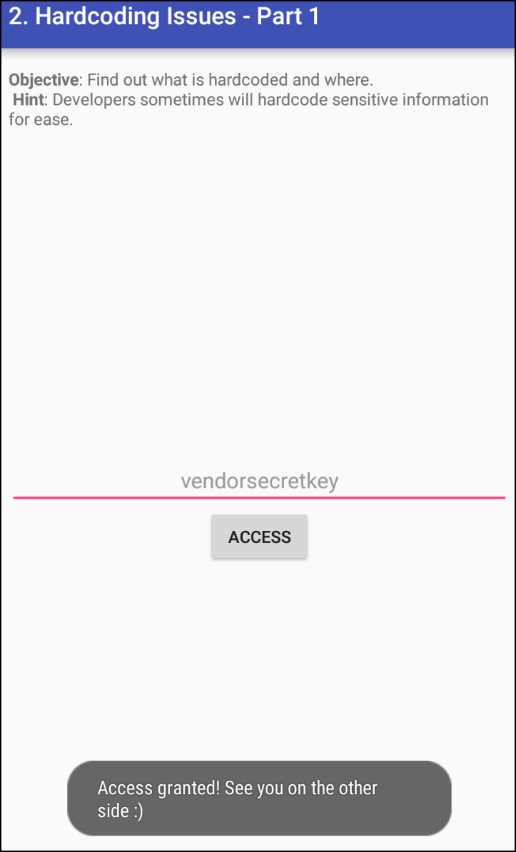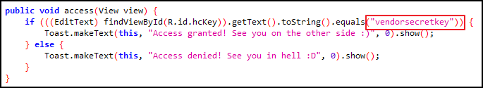 vendorsecretkey 키 값을 입력하면 Access granted! 메시지를 확인할 수 있다.