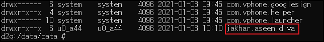 안드로이드에서 설치된 패키지의 데이터는 보통 /data/data 경로에 저장된다. jakhar.aseem.diva가 설치한 DIVA 앱이다.