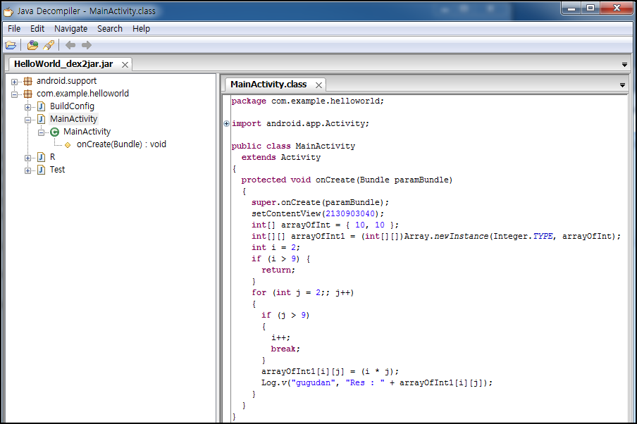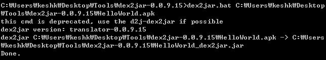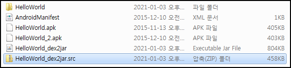 dex2jar 프로그램을 이용하여 HelloWorld.apk 파일을 jar 파일을 추출된 것을 알 수 있다.