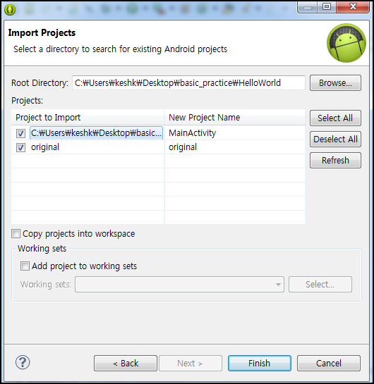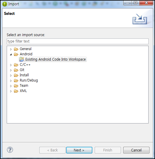 이클립스에서 Import를 하기 위해 Android - Existing Android Code Into Workspace를 선택해준다.